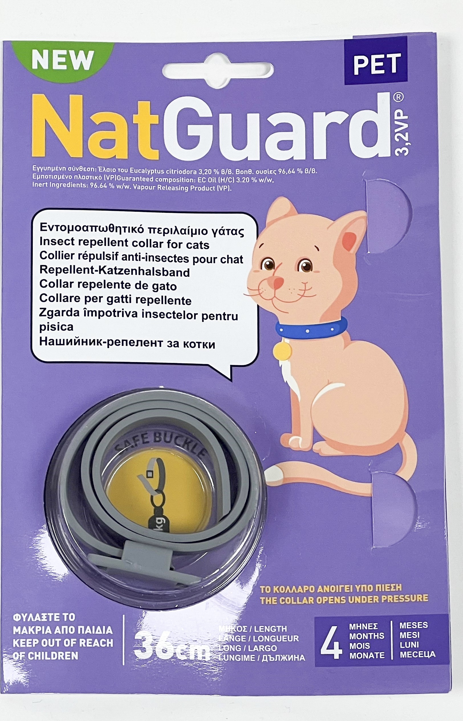 NatGuard αδιάβροχο εντομοαποθητικό κολάρο γάτας. Ασφαλής αγκράφα. Με 3,2% Citriodiol φυσική δραστική ουσία που απωθεί κουνούπια, ψύλλους, τσιμπούρια, ψείρες και μύγες. Προστατεύει τη γάτα για 4 μήνες. Με κουτάκι φύλαξης όταν δεν χρησιμοποιείται. Με διάρκεια ζωής 3 χρόνια. Χρησιμοποιείται όλο τον χρόνο.
